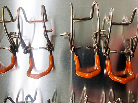 Info: Apply custom color plastisol to provided latches. Latches were approximately 2 inches tall and 1 inch wide. Coating was applied to about ¾” of the latch where the user would engage or disengage the clip.