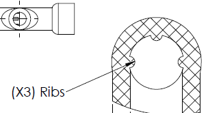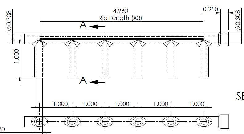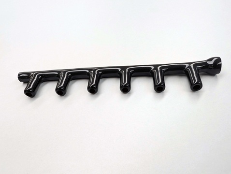 Info: 6" long water circulation manifold. 1" long ports one inch apart for interference fit with copper tubing utilizing a clamp. Bell end would be solvent bonded to tubing. Interior of manifold was designed with an internal rib to prevent blocking water flow if crimped.